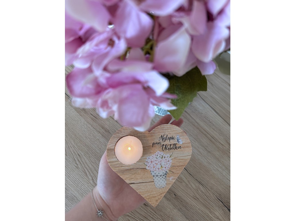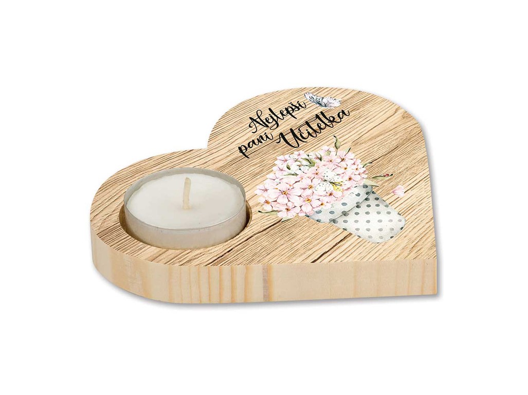 Stylový a srdečný dárek, kterým potěšíte každou paní učitelku. Tento dřevěný svícen ve tvaru srdce je navržen pro čajovou svíčku a zdobený nápisem „Nejlepší paní učitelka“. Spojuje v sobě přírodní materiál, jemný design a vděčné poselství.