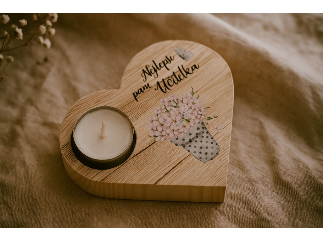 Rozměry dřevěného srdce: – šířka 12 cm – tloušťka materiálu je 1 cm Svíčka je součástí balení