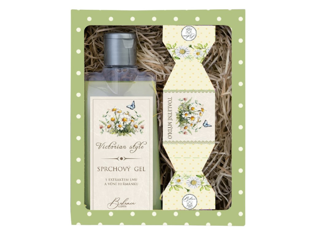 Dárková kosmetická sada Victorian Style obsahuje sprchový gel 200 ml a ručně vyráběné mýdlo 30 g s vůní heřmánku v dárkové balení. Kosmetický balíček je milým dárkem, navíc vyrobeným v ČR.
