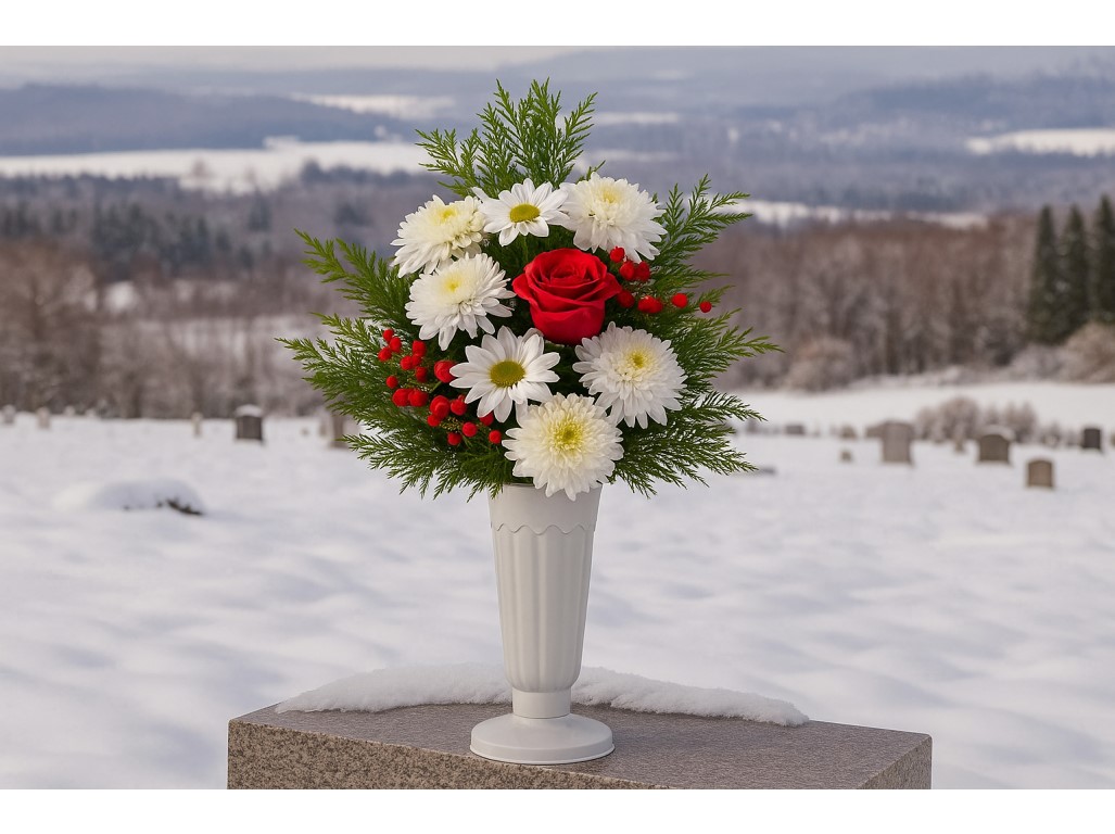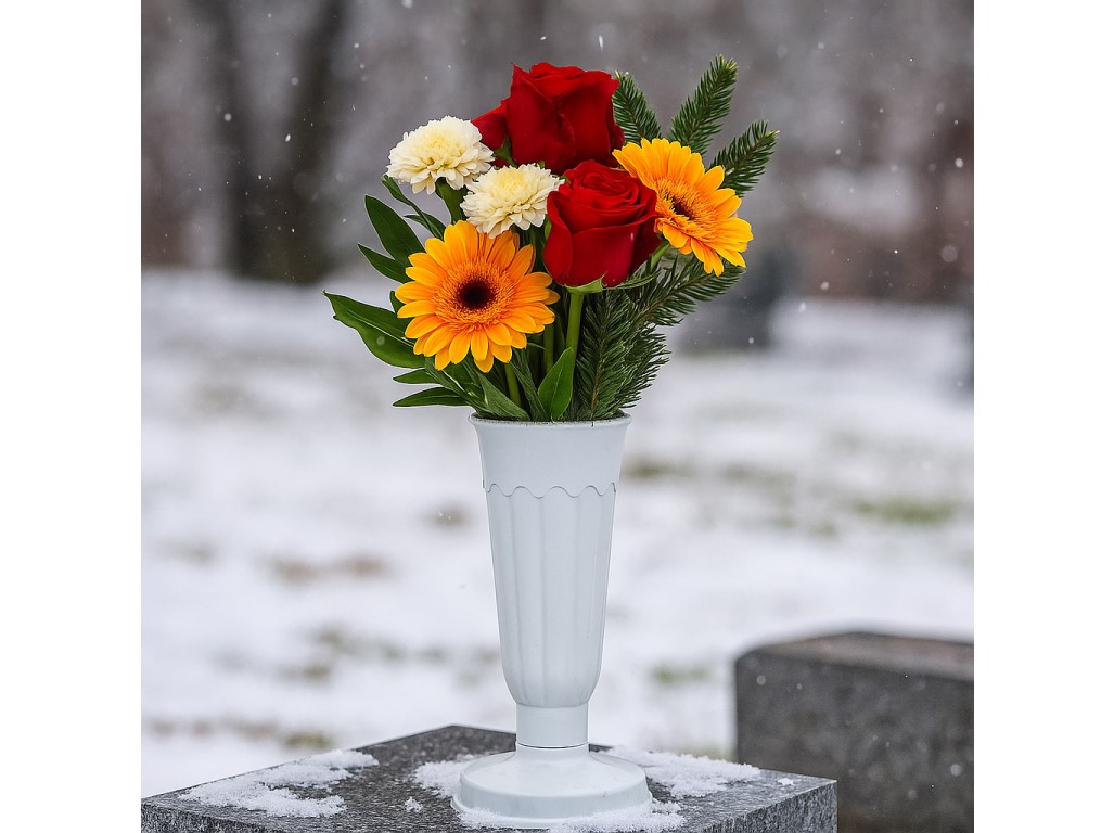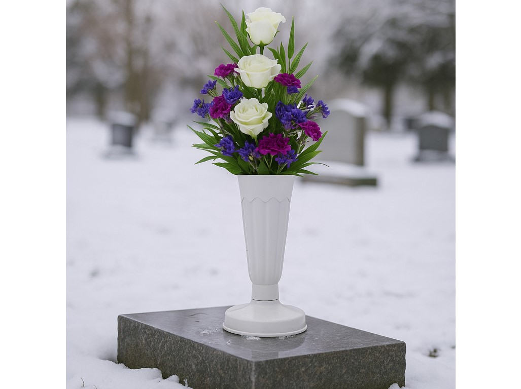 Plastová hřbitovní váza se zátěží pro bezpečné a stabilní umístění květin na hrobě. Jednobarevná, praktická a snadno udržovatelná.