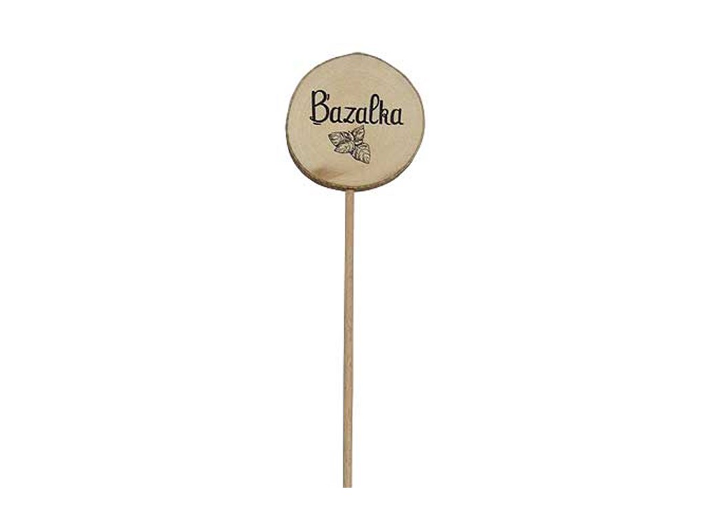 Dřevěný zápich s nápisem „bazalka“ pro označení bylinek v květináči nebo na záhoně.