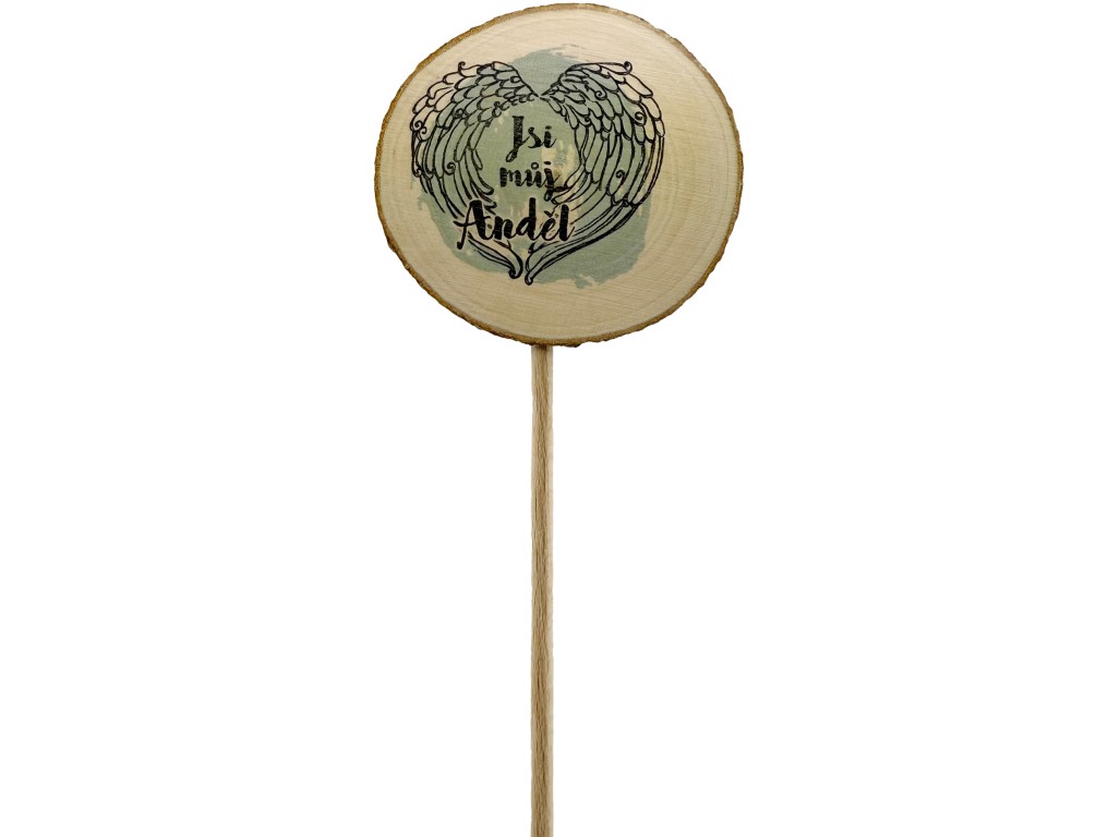 Vyjádřete své city originálním dřevěným zápichem „jsi můj anděl“. Ideální jako doplněk ke květině či dárek pro někoho, na kom vám opravdu záleží. Průměr kolečka je 5 – 8 cm, výška zapichovátka je přibližně 30 cm.