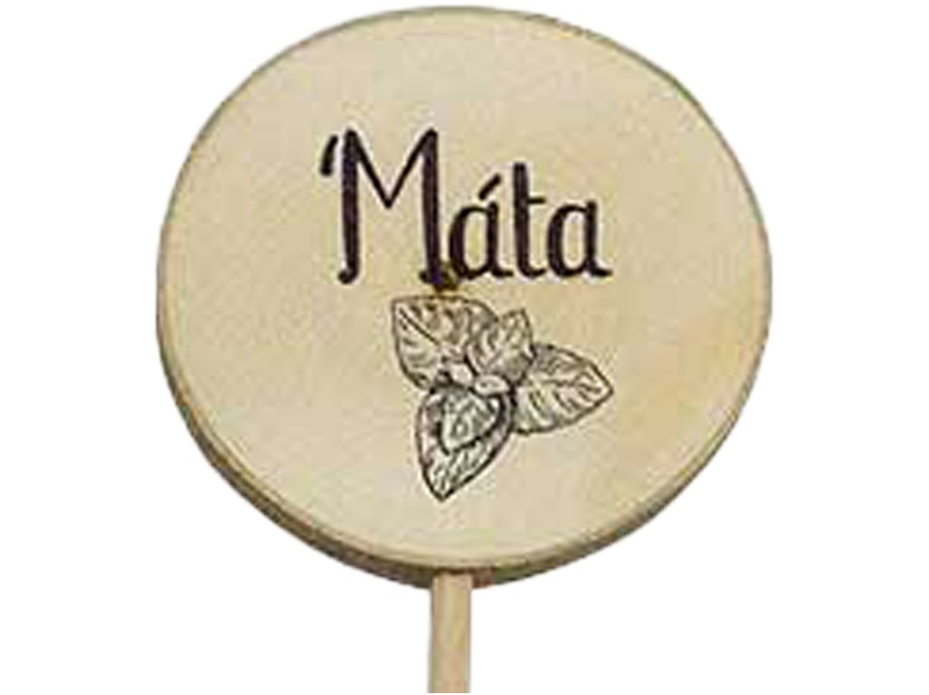 Dřevěný zápich s nápisem „máta“ pro označení bylinek v květináči nebo na záhoně.