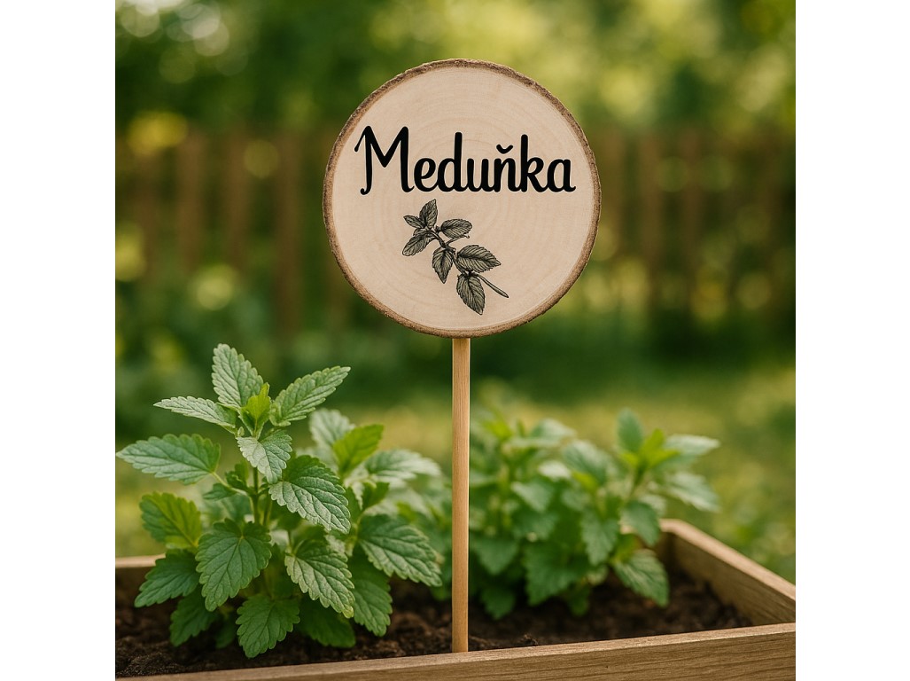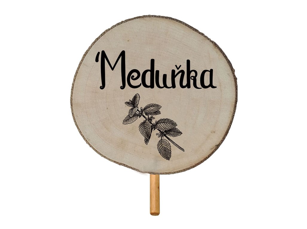 Dřevěný zápich s nápisem „meduňka“ pro označení bylinek v květináči nebo na záhoně.
