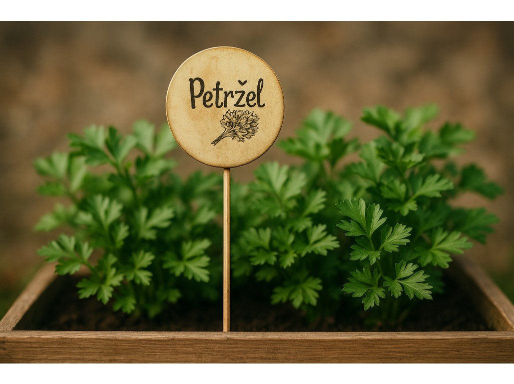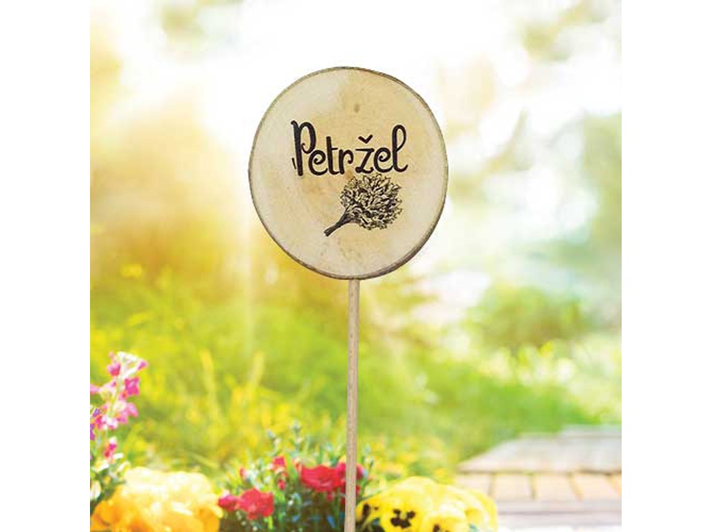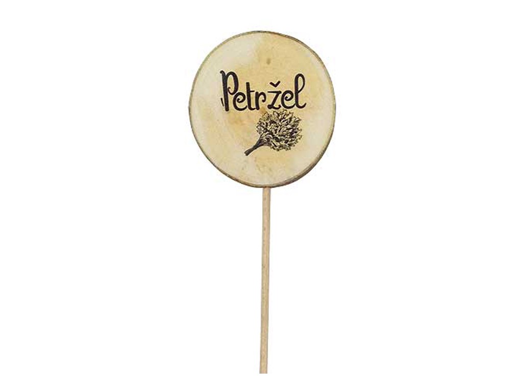 Dřevěný zápich s nápisem „petržel“ pro označení bylinek v květináči nebo na záhoně.